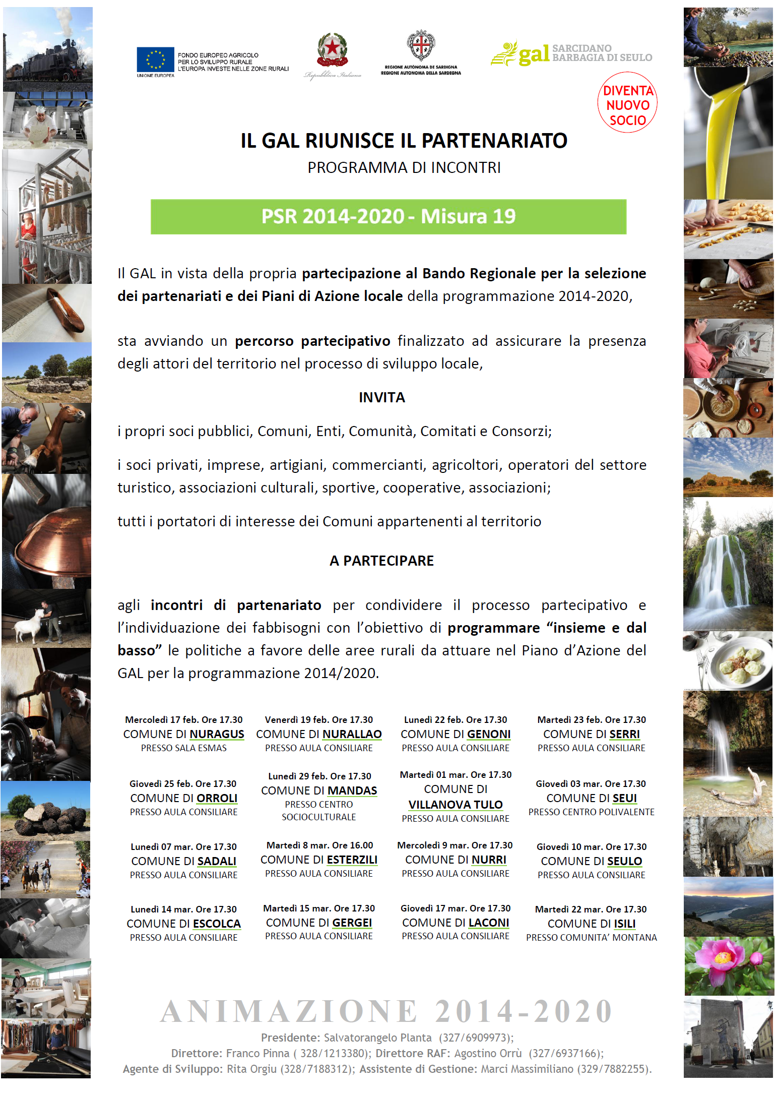 il GAL Sarcidano Barbagia di Seulo ha da subito attivato un percorso di animazione volto alla diffusione del bando stesso, alla consultazione degli operatori locali per rilevare i fabbisogni del territorio e alla raccolta di nuove adesioni da parte di operatori interessati a partecipare allo sviluppo locale in qualità di soci della Fondazione. Il percorso, organizzato e gestito dalla struttura tecnica del GAL nei mesi di gennaio, febbraio e marzo, ha fatto tappa in tutti e 13 i comuni aderenti nel periodo di programmazione 2007-2013 e i 3 nuovi comuni che hanno manifestato interesse all’adesione tra gennaio e febbraio del 2016; ha altresì coinvolto i giovani del territorio (studenti del Liceo Pitagora, il gruppo Giovani del Sarcidano), gli anziani (Università della terza età) e le associazioni di categoria.